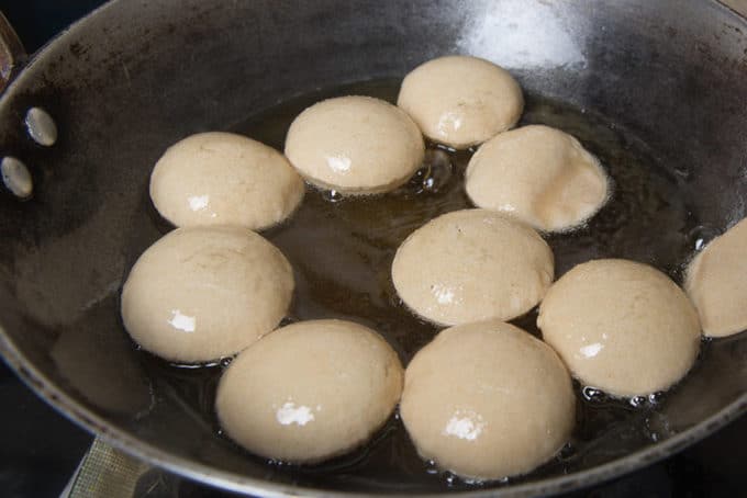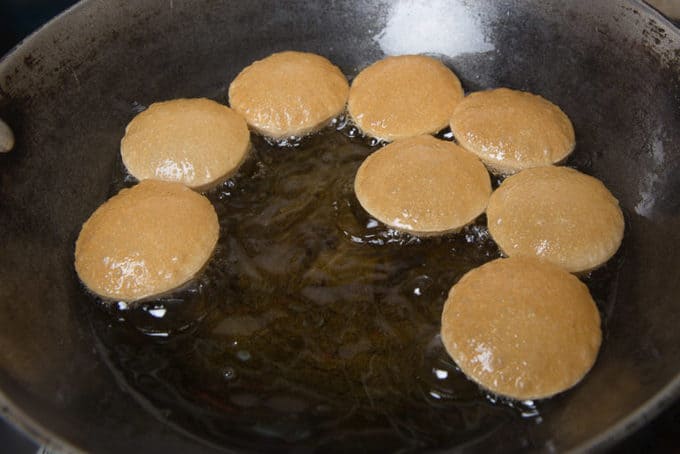 Heat oil for frying in a pan. Slide the puri into the hot oil and fry until they puff up and become golden brown. Gently press the purses with the back of the ladle.