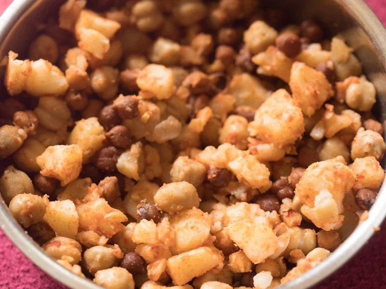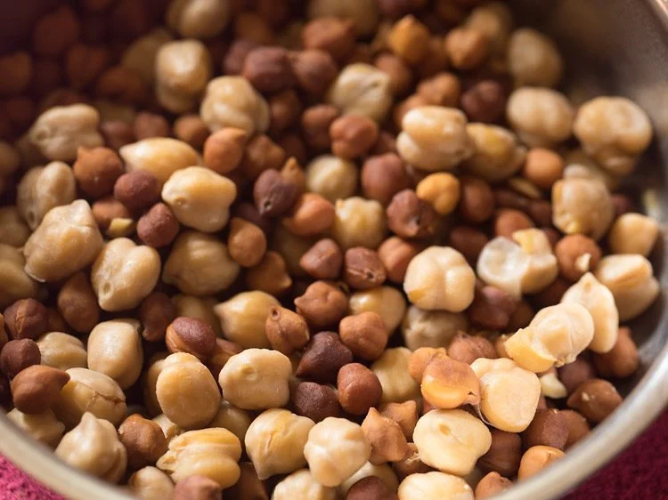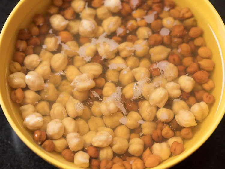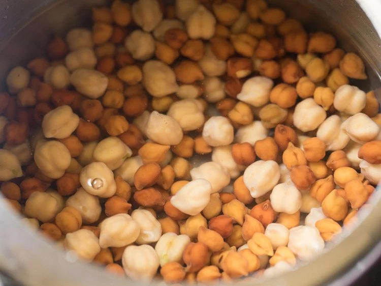 Rinse and then soak ⅓ cup white chickpeas and ⅓ cup black chickpeas in enough water overnight or for 8 to 9 hours. Later drain all the water and rinse the chickpeas very well in running water.