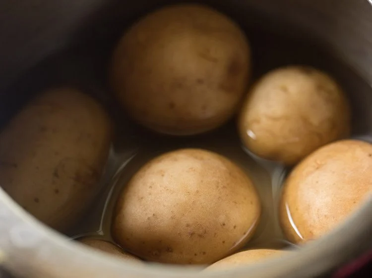 Pressure cook them for 5 to 6 whistles or 9 to 11 minutes on medium heat. In the picture below there are more potatoes as I added them in another chaat recipe.