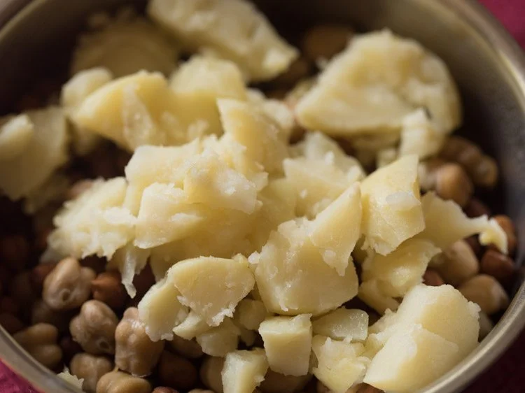 When the pressure settles down on its own in the cooker, remove the potatoes. Let them cool a bit. Then peel and chop them. Add the chopped potatoes to the cooked chickpeas.