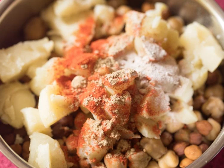 Now add 1 teaspoon amchur (dry mango powder), 1 teaspoon chaat masala, 1 pinch asafoetida (hing) and black salt as required.