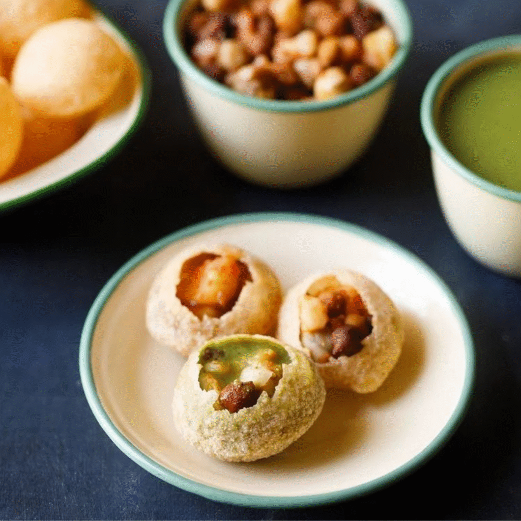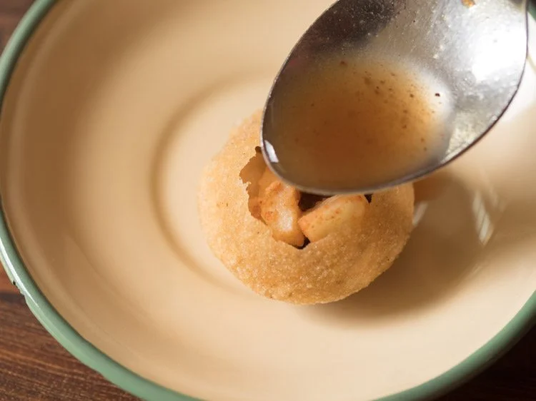 Place the chickpeas and potato stuffing inside the golgappa puri.