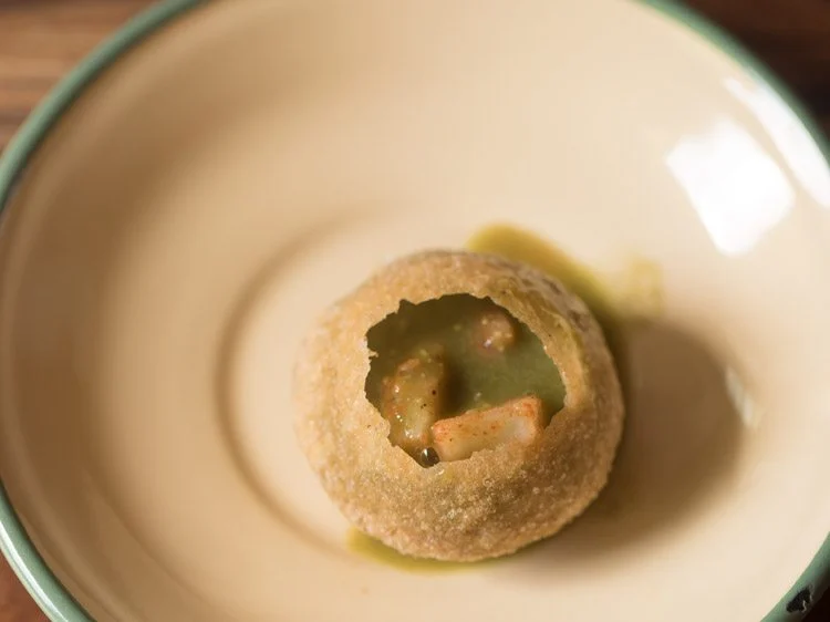 Take the golgappa puri in a small plate. Crack open the top with a spoon or with clean fingers.